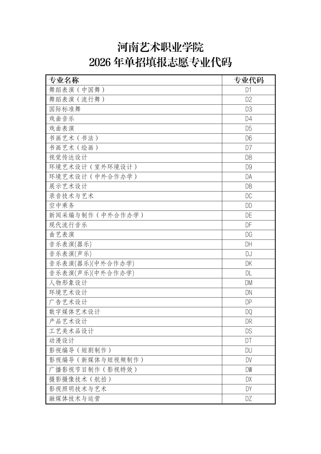 河南艺术职业学院2026年单招填报志愿专业代码
